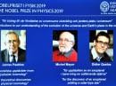 جیمز پیبلز (James Peebles) کیهانشناس دوتابعیتی آمریکایی-کانادایی و همچنین دو دانشمند سوئیسی، میشل مایور (Michel Mayor) و دیدیه کِلوز (Didier Queloz) برندگان جایزۀ نوبل فیزیک سال ٢٠١٩ هستند. نیمی از جایزه به دانشمند آمریکایی و نیمی دیگر به دو دانشمند سوئیسی تعلق میگیرد.
