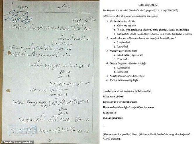 در اسنادی که به اسرائیل آورده شده، برگه ای وجود دارد که نشان می دهد رژیم ایران در ۱۸ سال پیش به طراحی کاهک اتمی برای نصب در موشک پرداخته بود که این امر ثابت می کند که حکومت از ابتدا قصد داشته به تولید سلاح هسته ای بپردازد و آن را برای نصب در کلاهک موشک های جنگی آماده سازد.