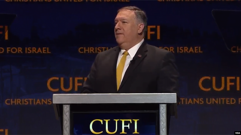 وزیر خارجه آمریکا روز دوشنبه ۱۷ تیر ماه و در جریان کنفرانس اتحاد مسیحیان برای اسرائیل گفت: جمهوری اسلامی ایران با ادیان دیگر ستیزه جویی دارد. مسلمانانی که از دین خود خارج شوند را مجازات میکند. ایران فعالان مسیحی را مجرمان امنیت ملی میداند و آنها را شکنجه میکند.