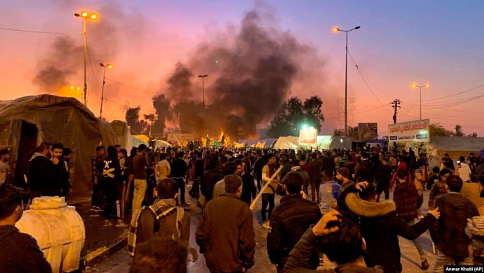به گفته معترضان، هواداران مقتدی صدر به محل تحصن آنها حمله کرده و چادرهای معترضان را به آتش کشیدند. گروهی از معترضان با استفاده از چوب دستی سعی کردند جلوی تهاجم آنها را بگیرند و تعدادی از آنها بر اثر تیراندازی زخمی شدند.