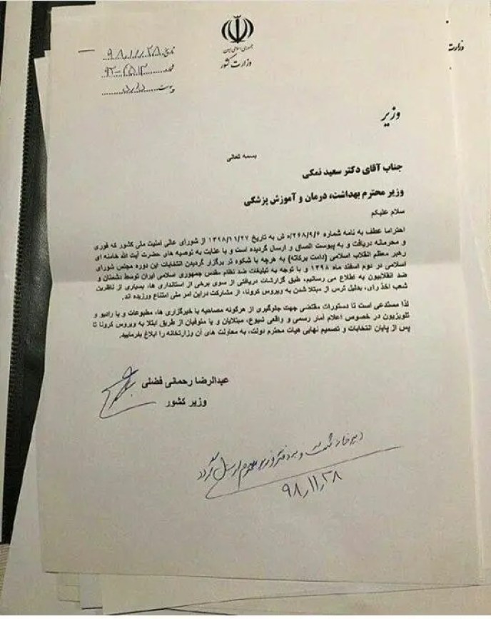این نامه به امضای عبدالرضا رحمانی فضلی، وزیر کشور رسیده و خطاب به سعید نمکی، وزیر بهداشت است.