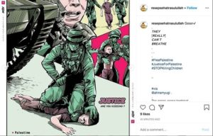 در زیر تصویر یک تروریست فلسطینی که سربازان اسرائیلی را از پشت هدف چاقو قرار داده و خود، هدف گلوله دفاعی سربازان قرار گرفته بود، و یک سرباز اسرائیلی دو دست او را به زمین چسبانده تا نتواند به تعرض ادامه دهد، نوشته شده است “من نمی توانم نفس بکشم” – سخنی که از زبان جورج فلوید شنیده شده بود.