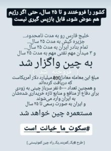 ابراز نگرانی بسیار ی از ایرانیان در شبکه های اجتماعی، در مورد آن که ممکن است حکومت اسلامی جزایر کیش و قشم را در اختیار دولت چین قرار دهد همچنان ادامه دارد و حتی پیشنهاد شده است که ایرانیان یک جنبش عمومی علیه چنین برنامه ای برپا سازند.