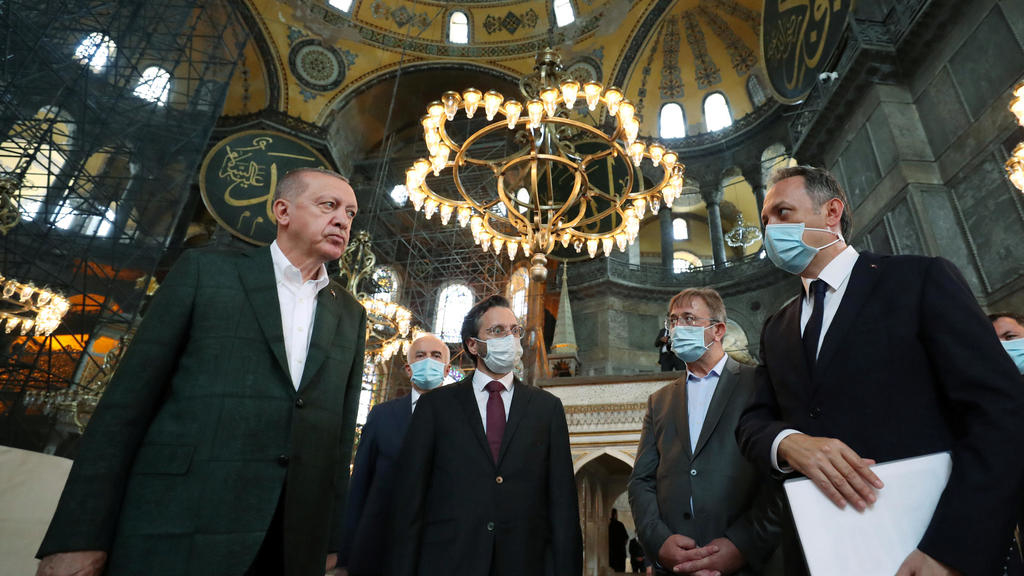 در پی صدور فرمان تغییر کاربری ایاصوفیه از موزه به مسجد، دولت ترکیه اعلام کرد که آثار و نقوش مسیحیت در این بنا، از جمله نقاشیهای بزرگ دیواری و موزاییکهایی که حاوی تصاویری از مریم مقدس و جبرئیل است، به هنگام برگزاری نماز با پرده پوشانده خواهد شد. قرار است روز جمعه ٢٤ ژوئیه/٣ مرداد، نخستین نماز جمعه در ایاصوفیه برگزار شود.