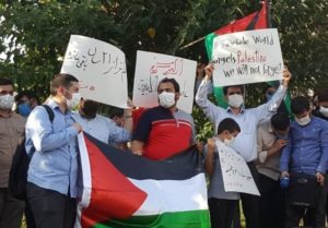 یک نماینده تندرو مجلس حکومت و تعدادی از دانشجویان بسیجی در اعتراض به توافق صلح امارات و اسرائیل در مقابل سفارت این کشور در تهران تجمع کردند