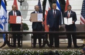 پرزیدنت ترامپ و نخست وزیر اسرائیل و وزیران خارجه امارات و بحرین نیز در هیچ مرحله ای از مراسم نقاب نصب نکرده بودند – آن ها از دست دادن با یکدیگر خودداری ورزیدند، ولی فاصله اجتماعی رعایت نشد.