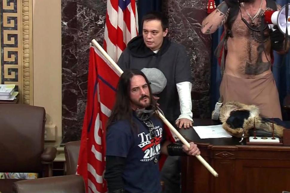 تصاویر ویدئویی نشان می دهد که هاجکینز 38 ساله ، پیراهن ترامپ 2020 را بر تن دارد ، پرچم بالای شانه و عینک چشم دور گردنش در داخل سنا بسته شده است. او یک سلفی با یک شمن توصیف شده خود در یک کلاه ایمنی شاخ دار و سایر آشوبگران روی گل مروارید پشت سر خود گرفت.
